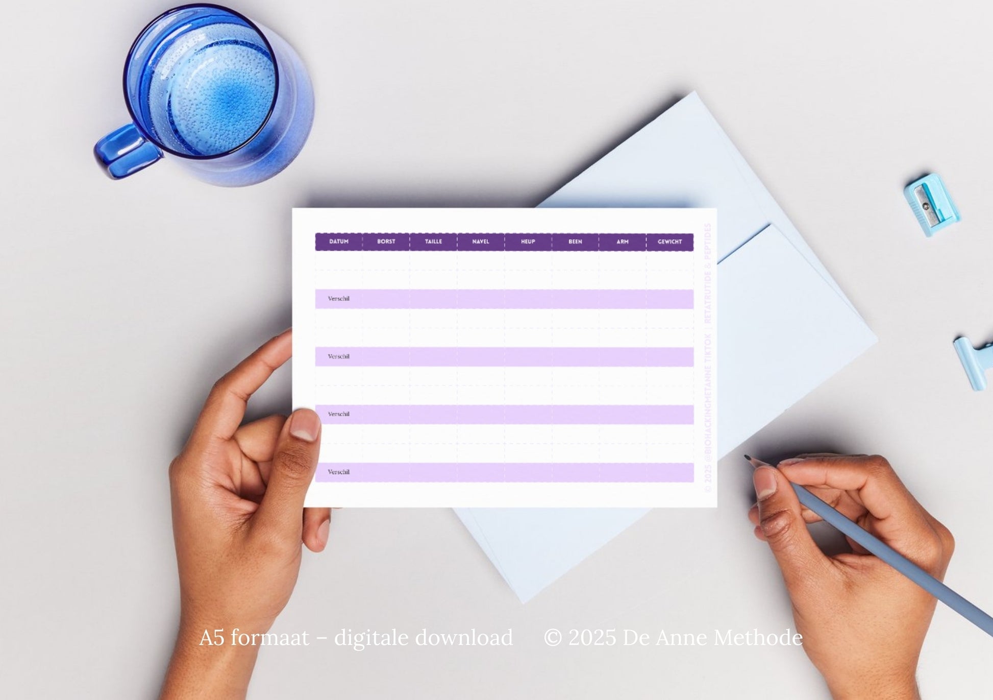 Een A5 PDF (digitaal bestand, geen fysiek product) met uitleg over meten, de belangrijkste meetpunten, een reflectiepagina en een tracker-tabel om je metingen en verschillen rustig te noteren.